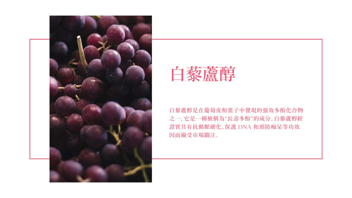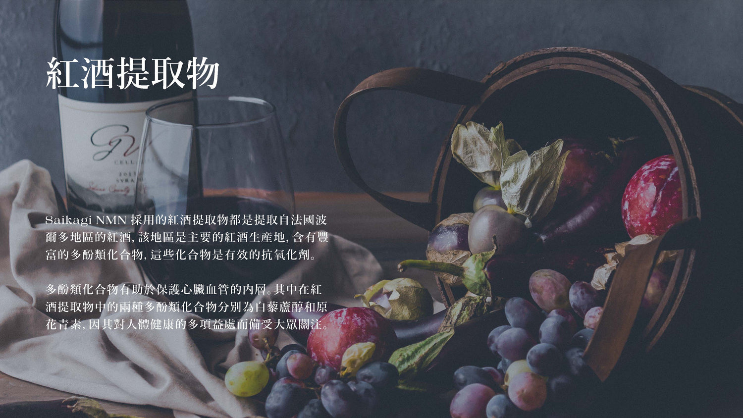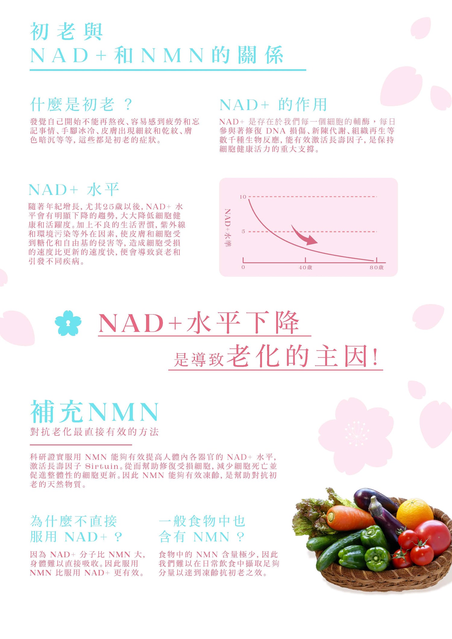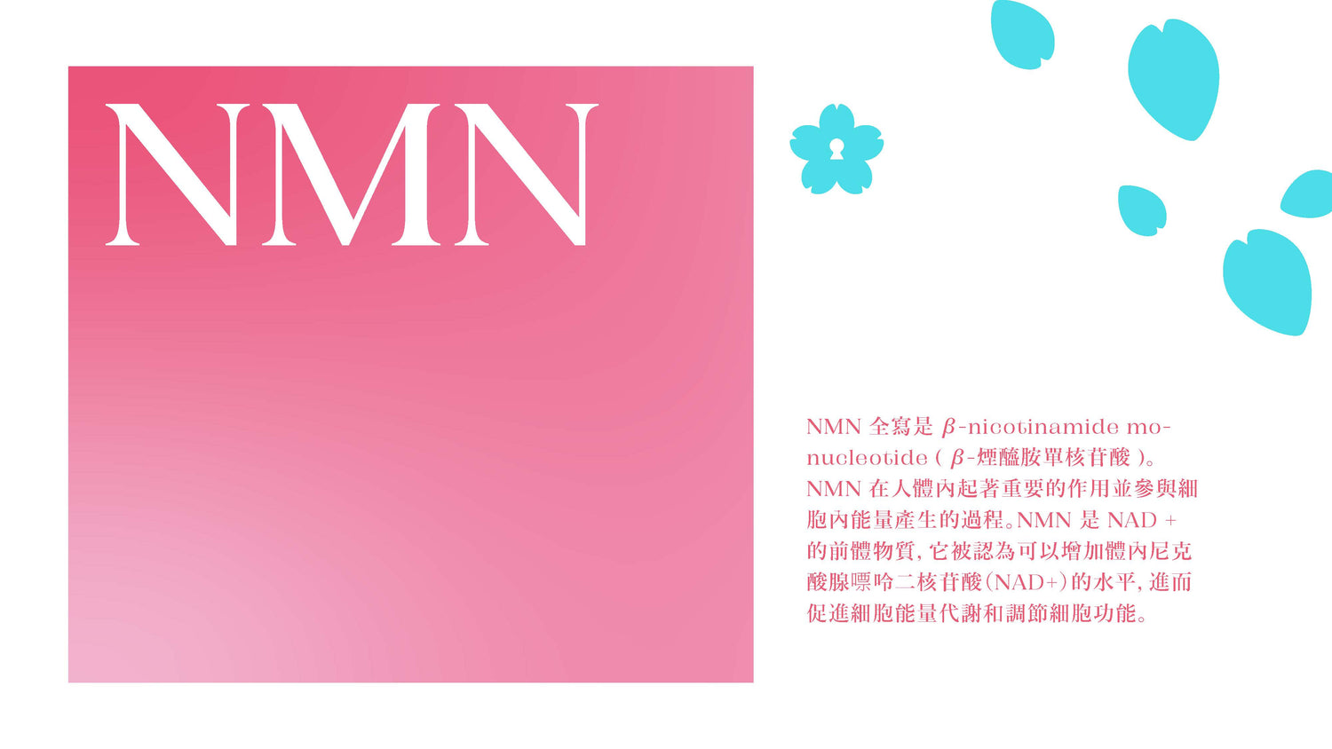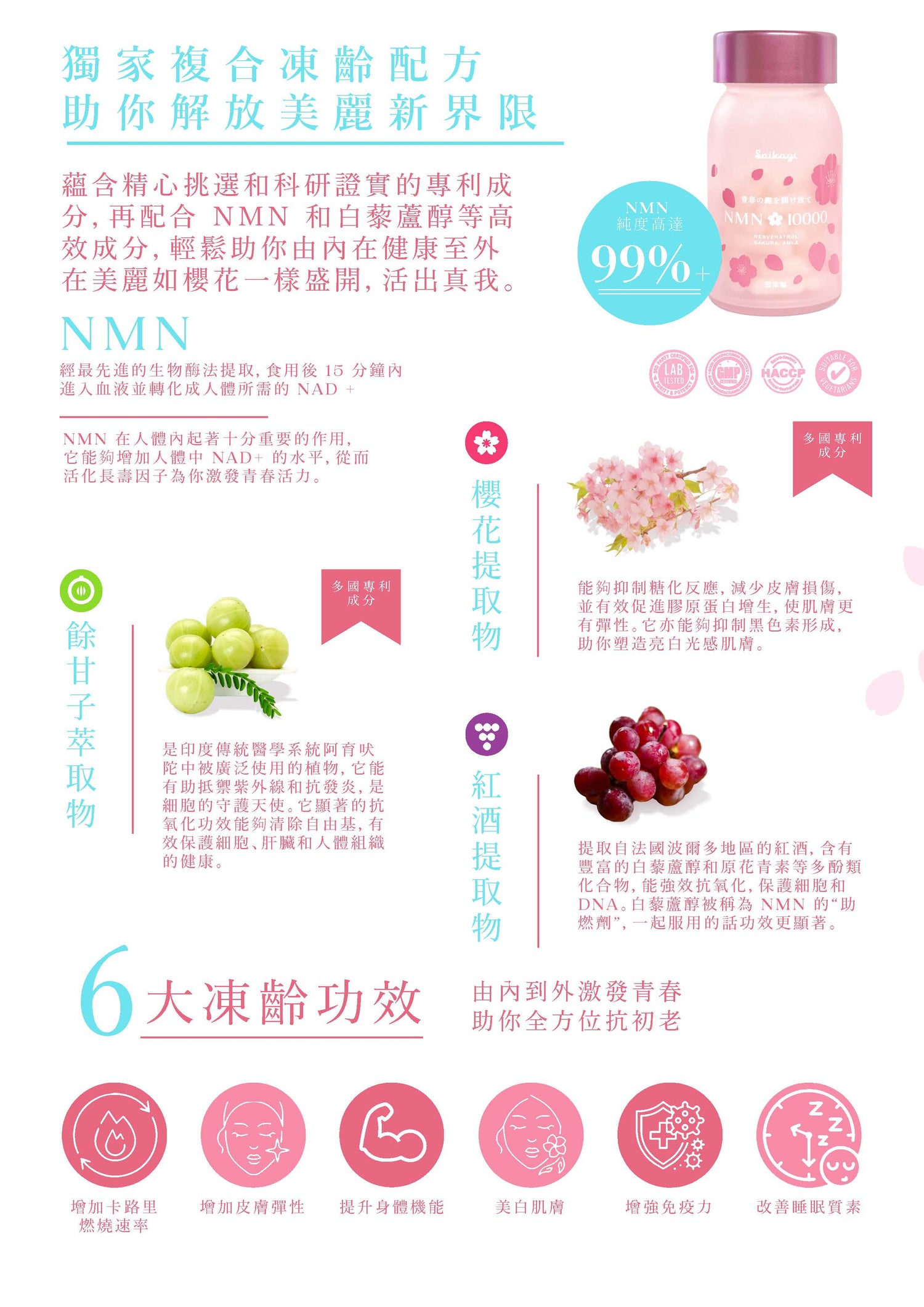 主要成份 : NMN ( β-煙醯胺單核苷酸 )、櫻花提取物、紅酒提取物、餘甘子萃取物