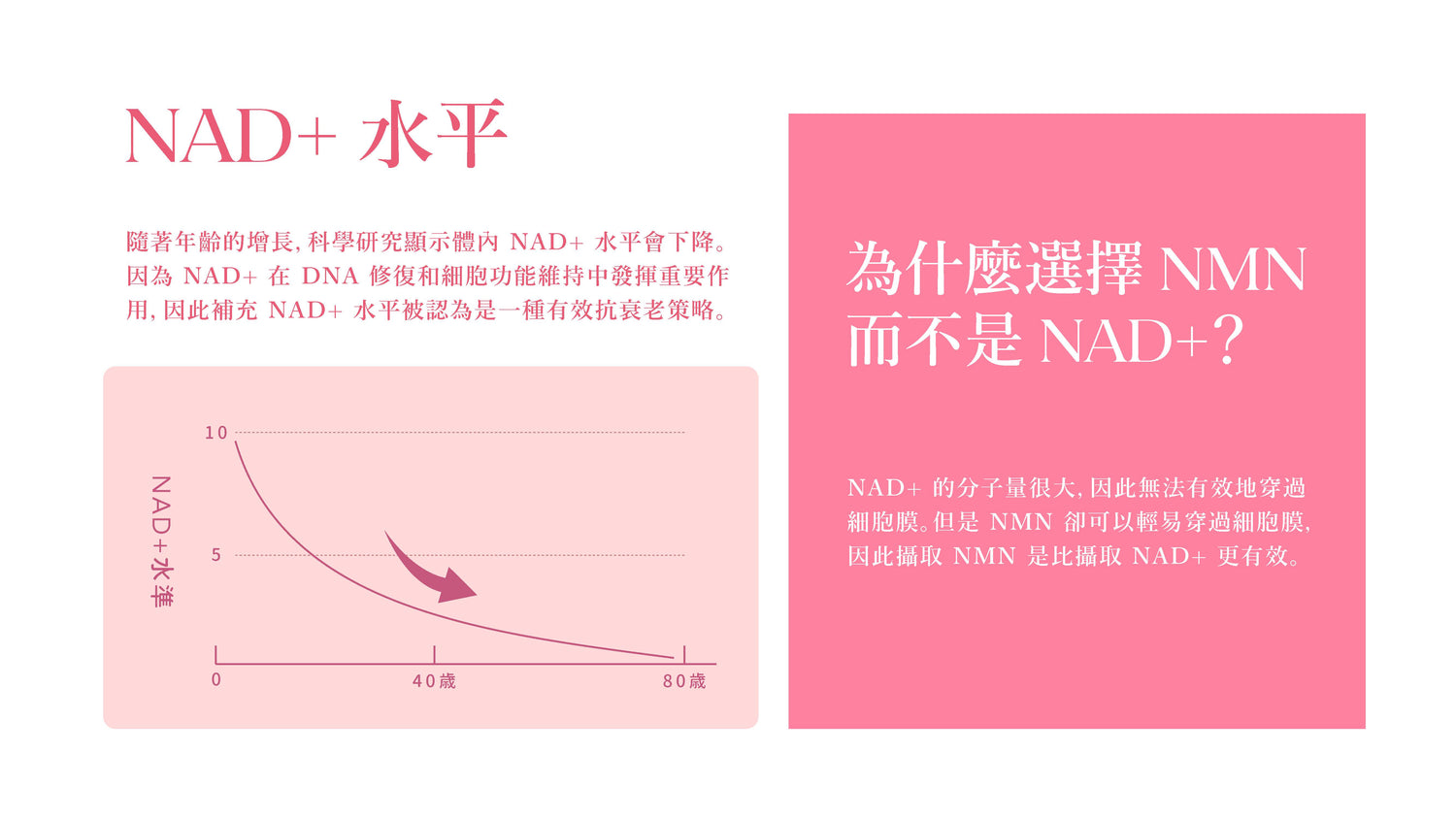 許多20歲左右的年輕族群,有熬夜及煙酒習慣對健康有要求的人士,想得到 NAD+ 帶來的種種好處便已可以開始服用,提早開始保養。而中、老年族群,更是必需服用 NMN 的族群!