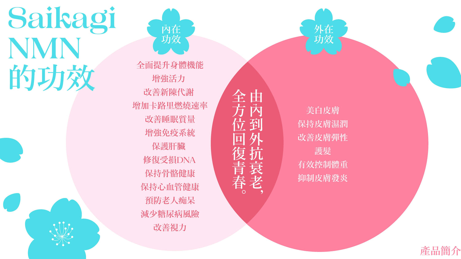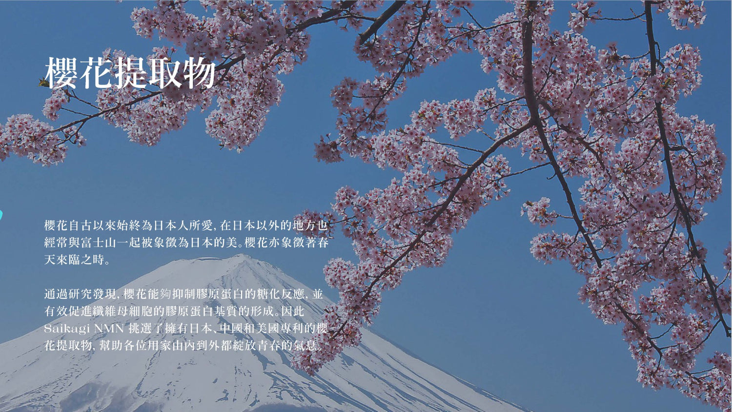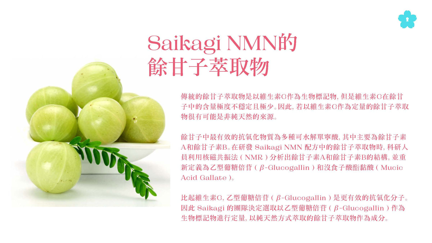 獨家科研配方 : Saikagi NMN 是市場上唯一擁有櫻花及餘甘子等獨家配方,效用比普通 NMN 產品更廣,效果也更顯著。