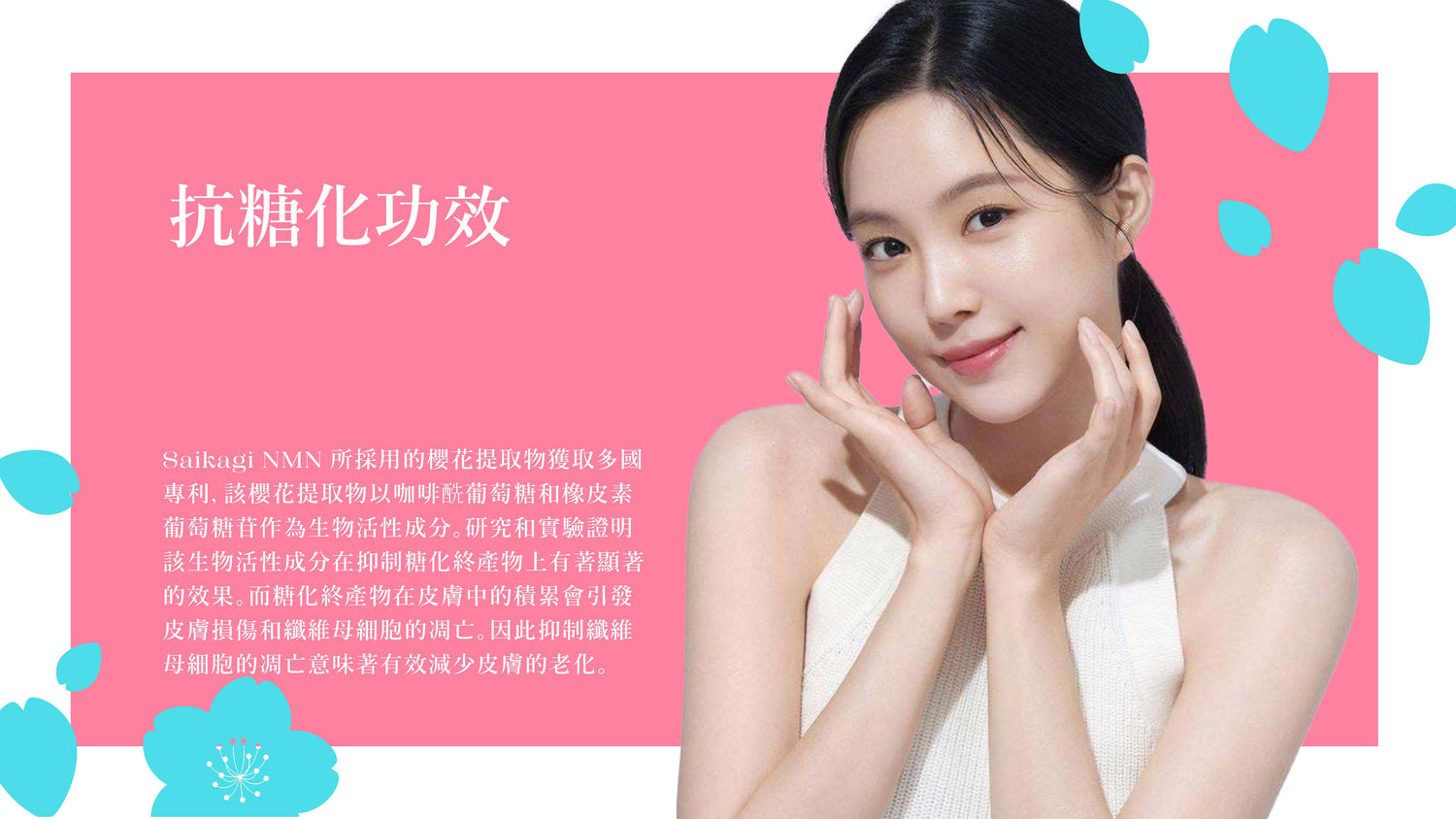 SAIKAGI 獨特配方融合NMN 與櫻花提取物等多種專利成分,直接激活長壽基因,能高效提升體內NAD+水平,重塑細胞活力,令你內外凍齡。