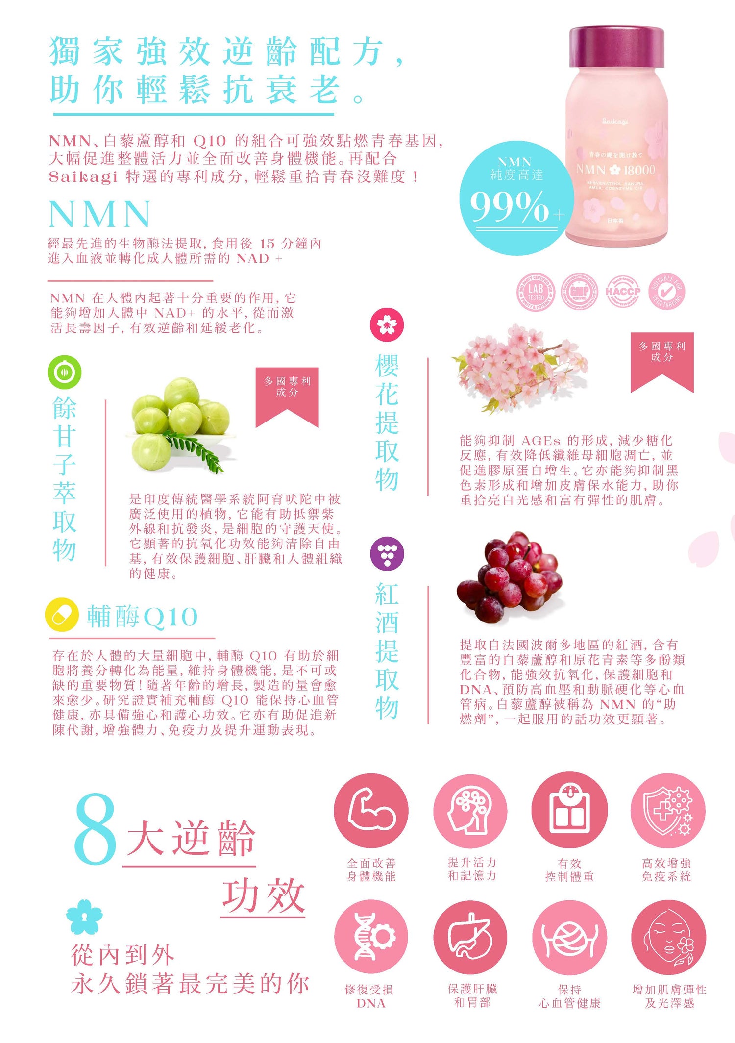 獨家科研配方 : Saikagi NMN 是市場上唯一擁有櫻花及餘甘子等獨家配方,效用比普通 NMN 產品更廣,效果也更顯著。