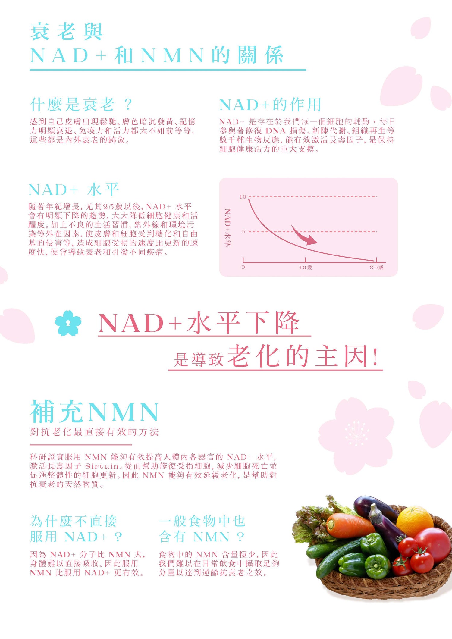 主要成份 : NMN ( β-煙醯胺單核苷酸 )、櫻花提取物、紅酒提取物、餘甘子萃取物、輔酶 Q10