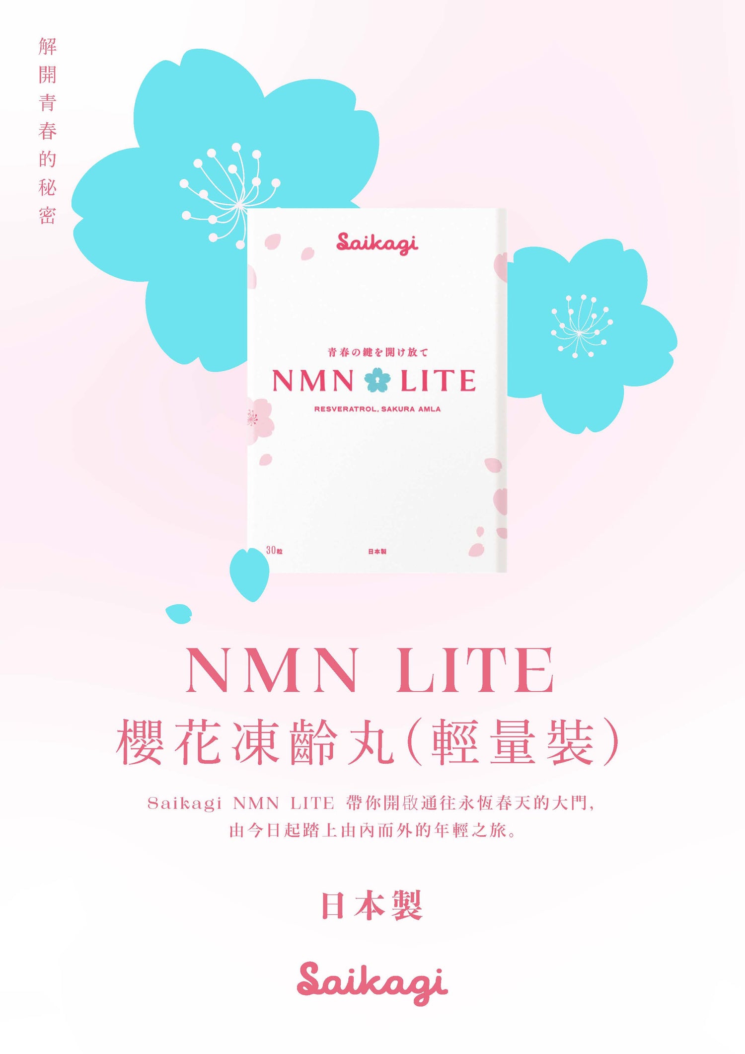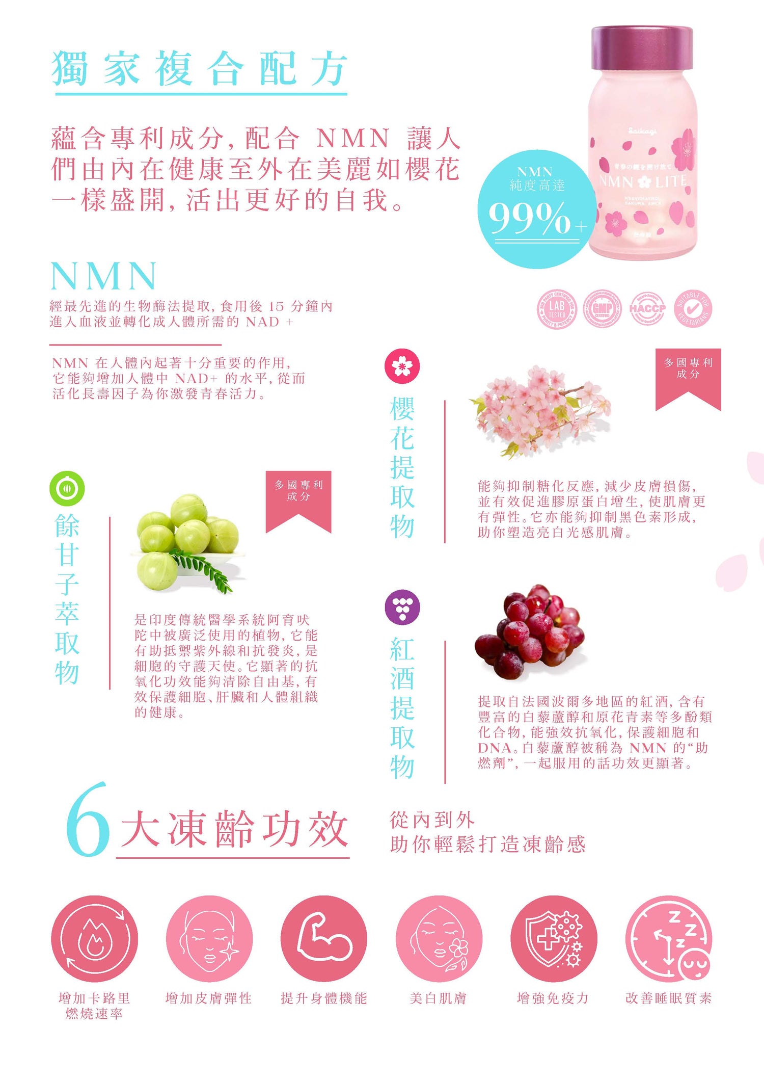 獨家科研配方 : Saikagi NMN 是市場上唯一擁有櫻花及餘甘子等獨家配方,效用比普通 NMN 產品更廣,效果也更顯著。